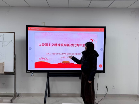 为深入学习贯彻习近平新时代中国特色社会主义思想,持续加强研究生思想政治引领,12月19日,化学与分子工程学院研究生会组织开展12月理论学习会。本次学习以“以爱国主义精神筑牢新时代青年思想根基”为主题,由学院研究生会综合事务部雷欣宇同学主讲,研究生会成员及学生代表积极参与。