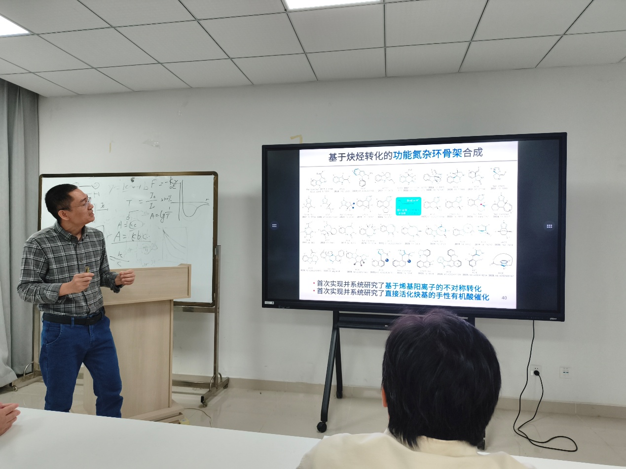 在报告中,叶龙武教授针对炔烃转化中的区域及对映选择性控制这一关键科学问题,围绕炔酰胺这类极化炔烃,建立了基于炔酰胺等杂原子取代炔烃的手性金属催化、手性有机酸催化、手性有机碱催化和可见光催化等催化新模式,为系列重要手性氮杂环的结构多样性合成提供了新方法、新策略和新途径。所发展的方法已应用于几十种含药物核心骨架的重要杂环分子(如中环、桥环、多环等)的高效和高对映选择性合成,并成功应用于几十种天然产物、生物活性分子和药物的简洁合成。报告期间,叶龙武教授与在场师生进行了热烈的互动交流,对老师和同学提出的问题给予了专业而细致的解答,对促进我院相关领域研究具有积极意义。
