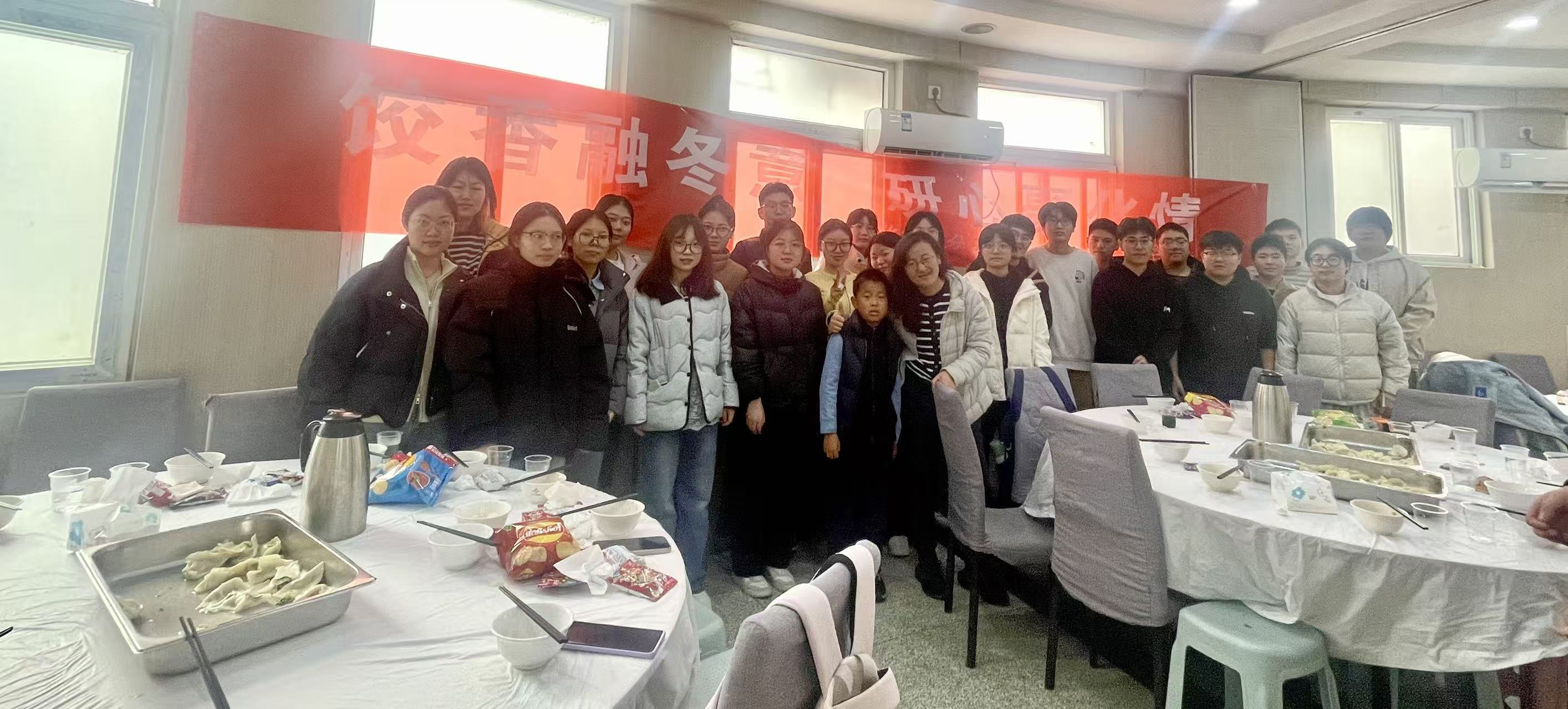 活动尾声,师生围站圆桌旁合影,满桌饺香与灿烂笑容定格成冬日暖景。此次团建以传统美食为纽带,既让同学们感受了冬至文化,更拉近了师生距离,未来学院将继续开展暖心活动,让班级成为科研路上的 “温暖后盾”。